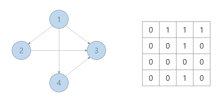 정점의 수가 N이라면 N x N 크기의 행렬을 만듦. 행렬의 각 원소를 한 정점과 또 다른 정점이 인접해 있는 경우(즉, 정점 사이에 간선이 존재)에는 1로 표시, 인접해 있지 않으면 0으로 표시.