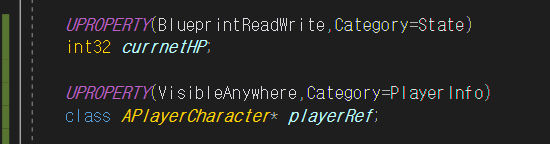 UPROPERTY는 멤버 변수 앞에 기술 되며, UPROPERTY내에 프로퍼티 지정자를 나열함으로, 해당 프로퍼티가 엔진과 에디터의 다양한 부분과 상호작용 할 수 있습니다.