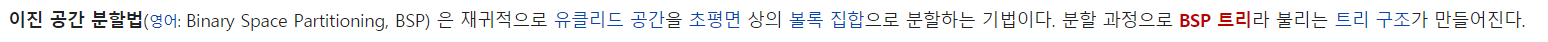 "이진 공간 분할 법은 하나의 공간을 특정한 최종 목적을 만족할 때까지 공간을 재귀적으로 2개씩 분할하는 과정이다. 예를 들면, 충돌 감지를 목적으로 하는 경우에는 원래 물체가 충분히 충돌 검사를 간단하게 할 수 있도록 공간이 분할되며 렌더링을 목적으로 하는 경우에는 화가 알고리즘을 가장 효율적으로 사용할 수 있도록 볼록한 도형으로 공간이 분할된다."
