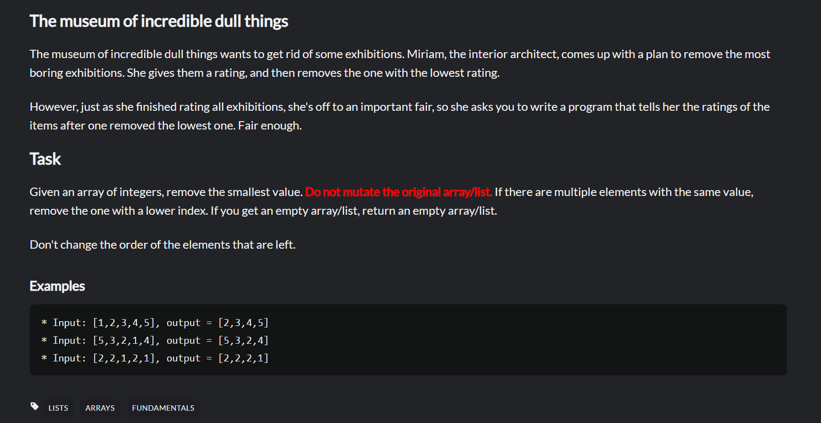 작업 조건으로는 정수 배열 vector 가 주어지면 가장 작은 값을 제거한다고 한다. 빨간글로 강조하는 것은 원래의 배열을 변형하면 안된다는 점이다. 값이 같다면 가장 낮은 인덱스를 제거한다고 한다. 또 조건이 배열이 비어있다면 빈 배열을 반환하라는 것이다.