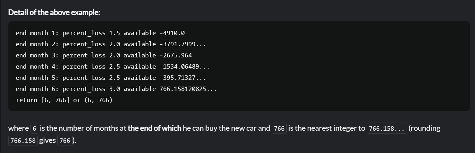 여기서 6은 그가 새 차를 살 수 있는 마지막 달 수이고 766은 766.158...에 가장 가까운 정수입니다(rounding 766.158은 766을 제공합니다).