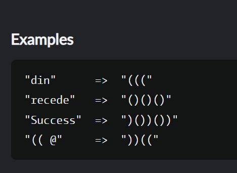 이 연습의 목표는 문자열을 새 문자열에 있는 각 문자가 원래 문자열에 한 번만 나타나는 경우 "(", 또는 원래 문자열에 두 번 이상 나타나는 경우 ")"인 새 문자열로 변환하는 것입니다.