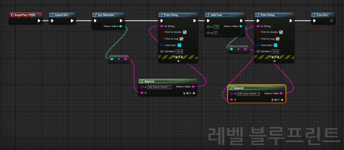 이번 시간에는 Unreal의 Blueprint를 이용해 직접 만든 DLL(Dynamic Link Library)을 사용하는 방법을 알아보겠습니다. 사용 예시 먼저 결과는 다음과 같습니다. 위 블루프린트에 보이는 Add Func 노드와 Add Str